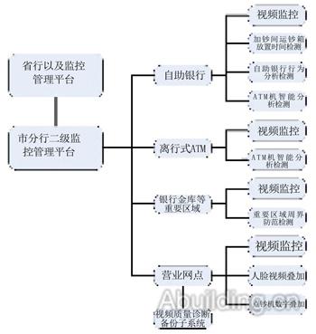 该银行智能监控联网平台将智能ATM机、金库、自助银行、营业网点等经银行专网接入分行监控管理中心,再通过银行监控专网接入省行监控管理中心及银行业务网。