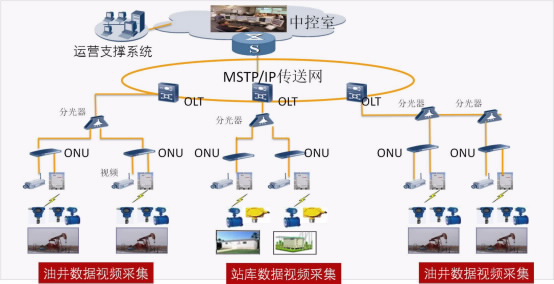 在油田计量站、处理站等站场铺设光纤形成MSTP/SDH的环网,在站场等区域配备一台光线路终端OLT(optical line terminal)设备,负责管理区域的光纤接入;OLT设备通过PON口连接光分配节点ODN(optical distribution node)设备,ODN实现1:n(n=2,4,8,16...)的光纤分光,分光后可以连接到每个油井,每个或多个油井配备一台广网络单元ONU(optical network unit)设备,ONU设备下行可以通过光纤或者网线连接到现场RTU设备和视频监控系统,实现现场生产数据和视频的回传。 3044AM永利时代