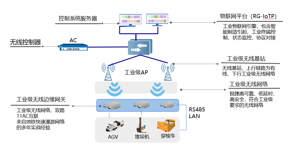 无人叉车,移动AGV为代表的移动机器设备作业范围大,移动距离远,数据丢包严重时常出现趴窝停运的状态,保障该类机器设备数据实时零丢包传输就成为关键点。