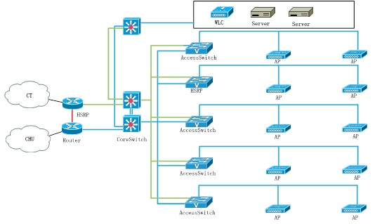 一到五楼面积一样,每层楼布局几乎一样,人数较多,所以在第一楼到5楼部署AP2602 ,每层楼AP通过网线连接到楼层的访问层交换机上(AccessSwitch),访问层交换机是支持PoE供电,所有AP通过网络供电。核心机房在三楼,在服务器区交换机上连接5508无线控制器,无线控制器采用端口聚合的方式与服务器交换机相连。