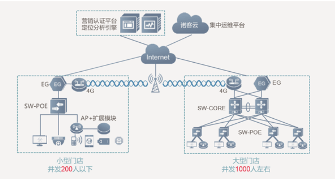 新零售门店无线解决方案围绕新零售行业的核心需求,采用锐捷诺客云管平台、双出口链路智能切换等技术,降低客户成本的同时保障业务运营不间断,提升运营效率。
