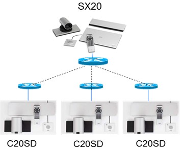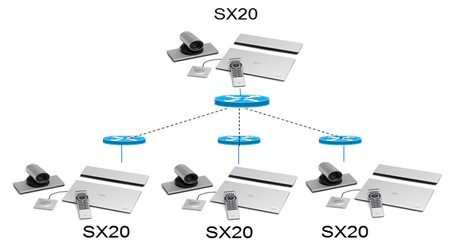 用户通信需求≤4方,可以使用1*SX20+n*C20SD(n≤3),此种模式可以在投资最小的情况下召开准高清会议。可通过License升级至1080P会议。
