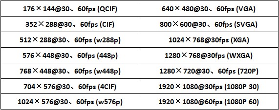 720P 30帧/秒、720P 60帧/秒、1080P 30帧/秒、1080P 60帧/秒