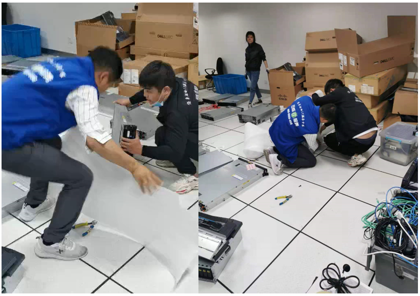 本次机房搬迁服务技术服务已经确定,剩下的只有网络设备的纯物理搬迁,为了保障搬迁工作的高效有序进行,云烁IT服务技术团队明确分工,将机房搬迁这项服务细分,并且制定了详细的搬迁方案与应急方案。搬迁工作中负责人有条不紊地进行物理拆机、搬运、装机、布线、连路、启动、调试等各项工作。