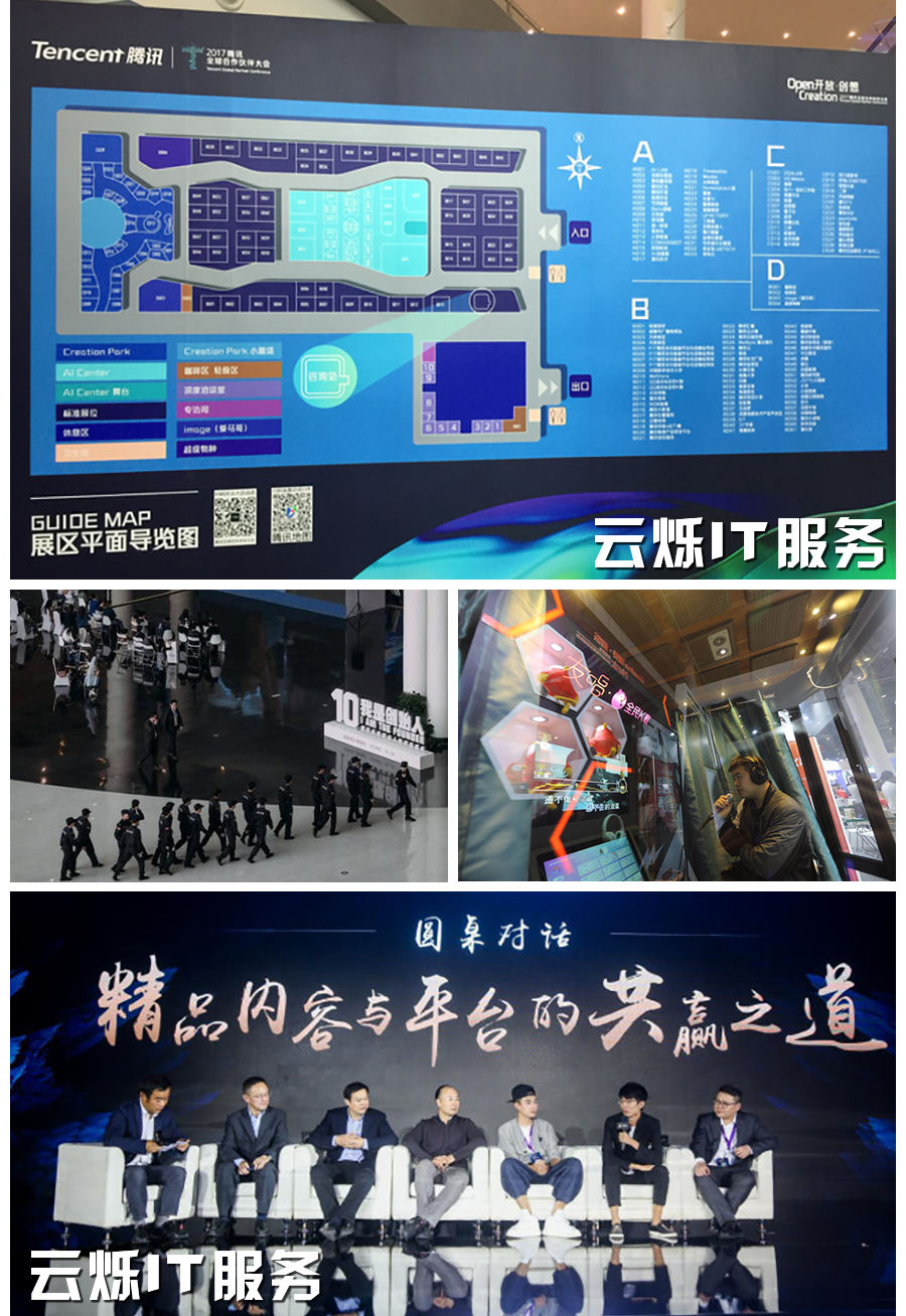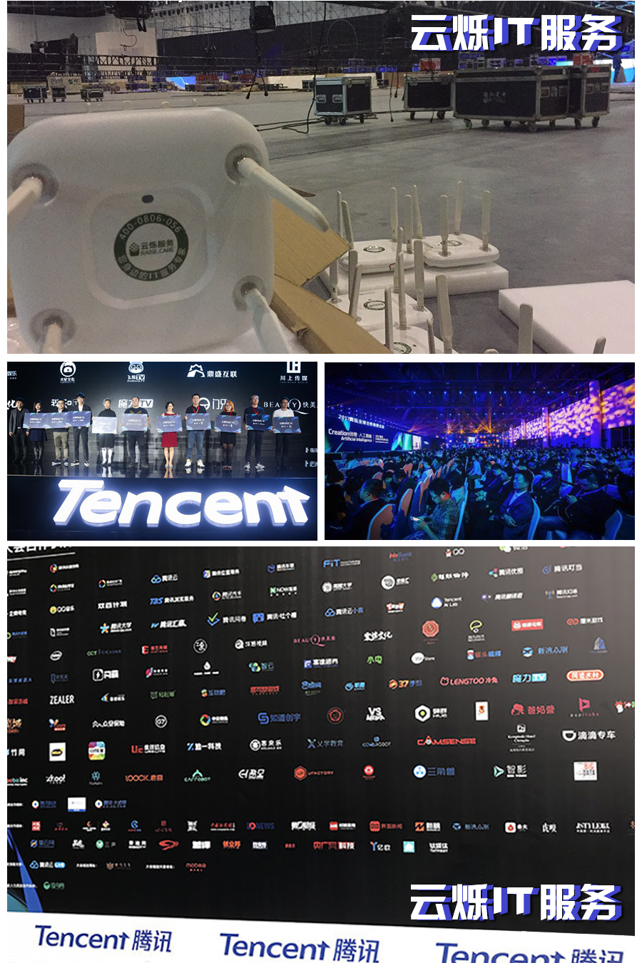 会场IT无线案例:为期三天的2017年腾讯合作伙伴大会在成都举办,腾讯分别从“创想·QQ”、“创想•微信”、“创想•内容”、“创想•人工智能”、“创想•云计算”五大板块出发,公布最新的开放战略。