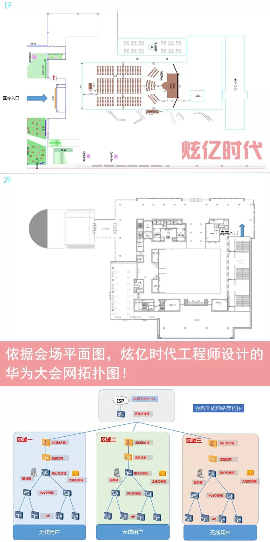 大会在北京华为会展中心举办,会场面积高达1万平米,分为上下2层。由于活动区域较为分散, 3044AM永利时代 工程师和主办方多次沟通需求后,依据现场平面图为此次大会设计的拓扑图如下: