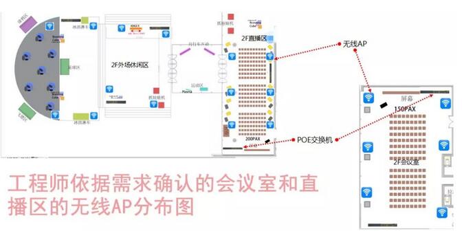 此次大会针对主会场、直播区、展区、同传区等不同的用网需求,将现场500M带宽合理划分。其中主会场、直播区是高密度WiFi覆盖区域, 3044AM永利时代 工程师凭借专业、丰富经验并结合实际情况,对该区域设计如下: 3044AM永利时代