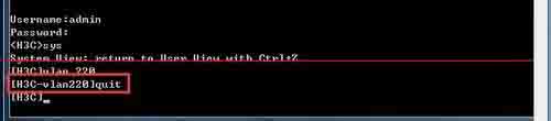 4、VLAN视图:在系统视图下输入"vlan 220" 就可以进入VLAN视图,主要完成对VLAN的配置,如图所示: