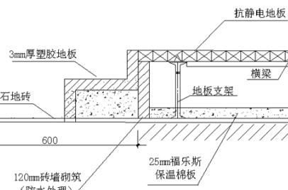铺设防静电地板,地板支撑脚直接装置在50*0.1紫铜片上方。敷设地板时,用水泡水平仪逐渐找平,高度靠可调支架调节,相临地板间不得有缝隙,装置较重设备的地板下部加强支撑。地板板面标高300~350mm,具有满足空间构成地板下净压风库。