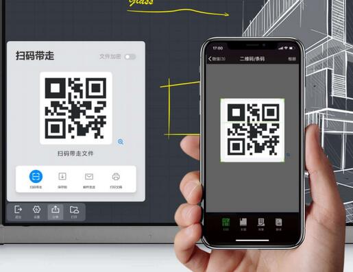 扫码带走是MAXHUB会议平板最方便的保存方式,在屏幕左下方点开菜单选项,点击扫码带走的选项。屏幕弹出二维码,参会人员用微信扫码,即可带走所有开会记录内容。若重要文件,还可以进行加密。
