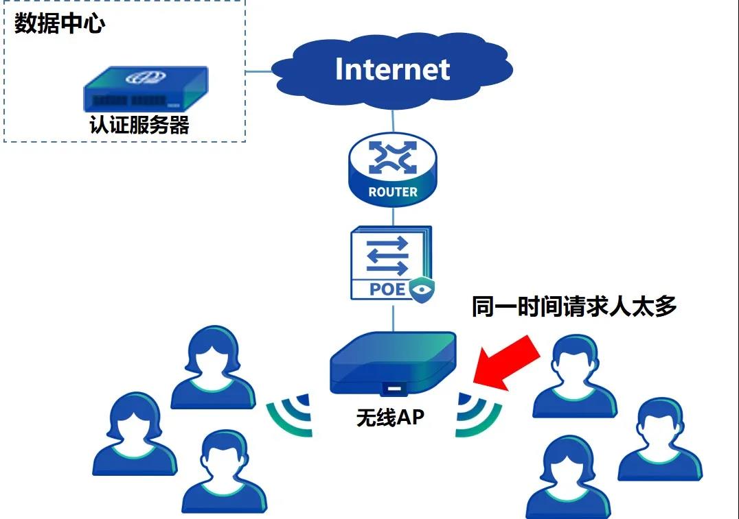 机场、酒店大厅等公共区域同时间上网的人太多,大量用户同时申请认证,瞬间流量太大,设备难以承载。