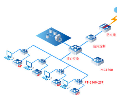 而在无线部署方式上,以达到覆盖主楼大厅以及会议室无线应用区域为前提,混合采用明装、暗装双重方式,室内AP接入点设备采用天花板吸顶方式安装。为配合无线AP部署实施的需要,我们采用了PT-2960-28P安全接入交换机,提供POE供电支持,为远端AP供电,无线控制器采用PW-MC1500,侧挂在核心交换机旁,实现对 多AP统一管理及控制监控接入AP设备状态。