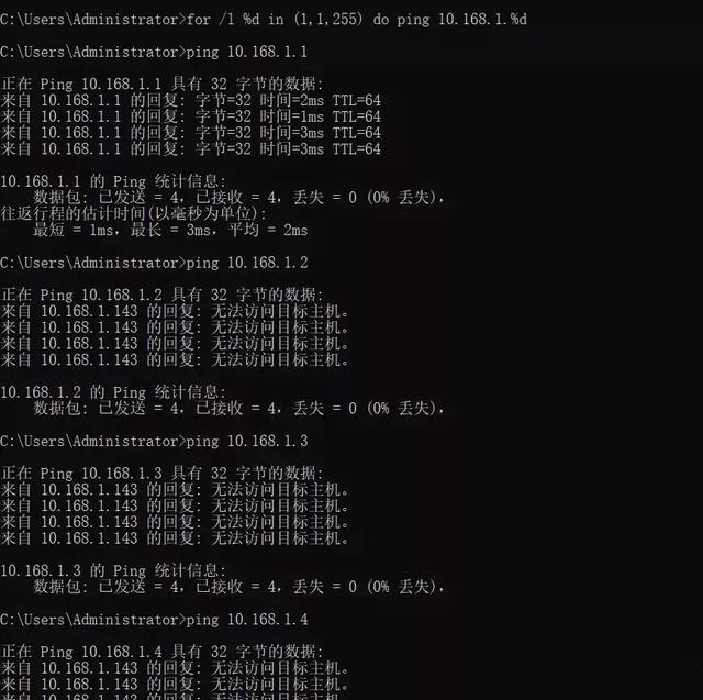 当输入批量命令后,那么它就自动把网段内所有的ip地址都ping完为止。