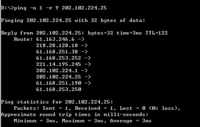 ping -n 1 -r 9 202.102.224.25 (发送一个数据包,最多记录9个路由)