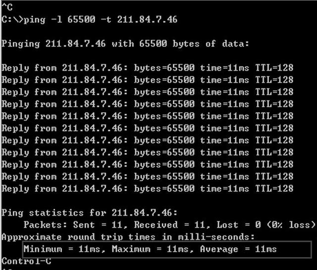 这样它就会不停的向211.84.7.46计算机发送大小为65500byt的数据包,如果你只有一台计算机也许没有什么效果,但如果有很多计算机那么就可以使对方完全瘫痪,网络严重堵塞,由此可见威力非同小可。