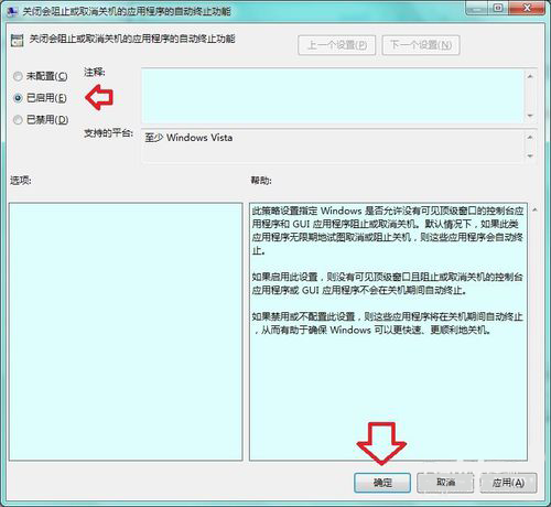3、然后把“末设置”改成“已启用”,确定直接退出就可以了。重新启动下电脑,以后关机就再也不会出现强制关机页面了,系统会自动关闭未关闭的软件程序安全退出关机。