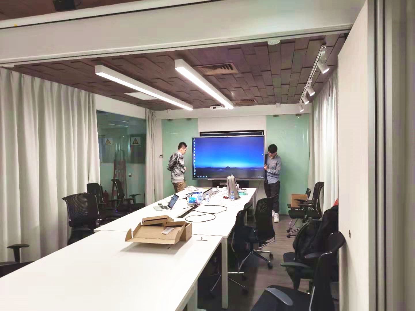 3044AM永利时代现场安装MAXHUB视频会议终端产品,替换原有过于画面声音卡顿,反应慢且功能单一的陈旧设备,使企业用户利用SKYPE即时通讯软件,通过软视频终端,借助vpn与国外多个企业开视频会议。
